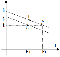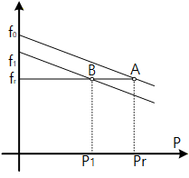 A점에서 운전중 즉, 부하에 Pr의 전력을 공급하고 있다. 부하가 감소하여 P1의 전력을 소비하면 원동기가 일정하게 유지할때 주파수는 f1으로 증가하게 된다. 원동기의 속도를 줄이면 다시 주파수를 fr로 만들 수 있다. (C지점)